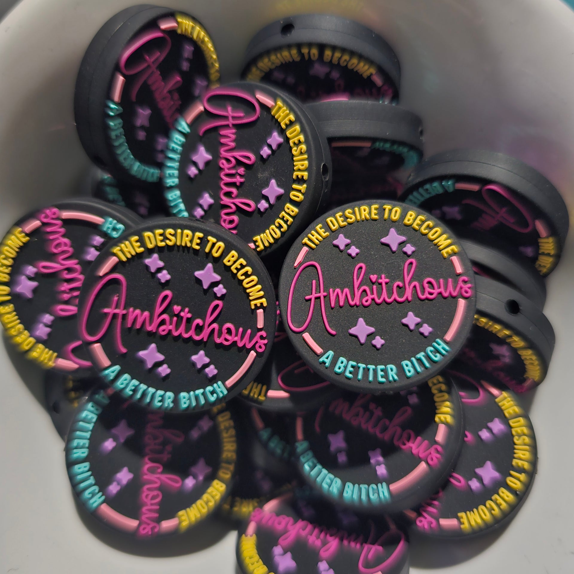 Unleash your inner boss with the Be A Better B*tch - Be Ambitchous Focal Bead! Make strides in your ambition and own your power with this playful bead. Boost your confidence and channel your inner diva with this unique focal bead.