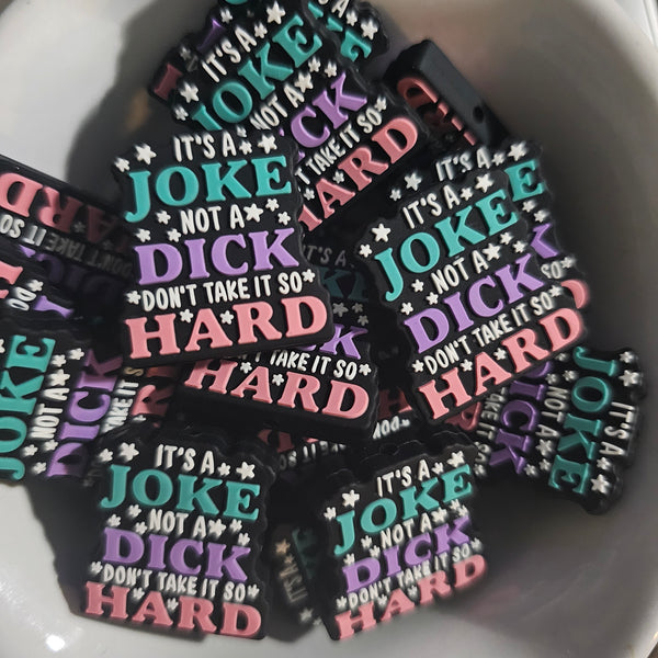 Lighten the mood with the It's A Joke Focal Bead. Featuring the phrase 'It's a joke not a d*ck, don't take it so hard', this quirky piece adds a playful touch to any project. Perfect for those who don't take themselves too seriously!