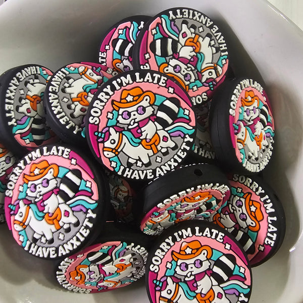 Stay punctual and make a statement with our Sorry I'm Late anxiety focal bead! This quirky cat bead is perfect for those with a playful sense of humor. Express yourself and add a touch of fun to any project with this unique conversation starter.